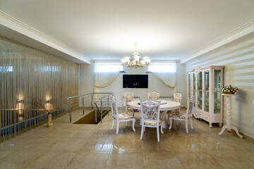 Первый этаж: комната, кухня совмещенная с залом (холл), обеденная зона, санузел, бассейн, спуск в винный погреб.