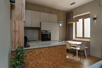• Светлая и тёплая: панорамные окна наполняют пространство солнечным светом и открывают захватывающий вид на город и бухту.