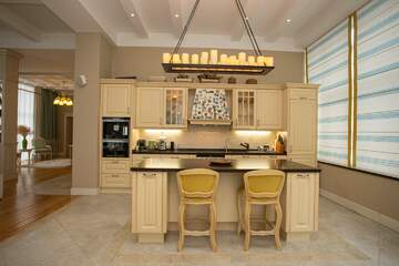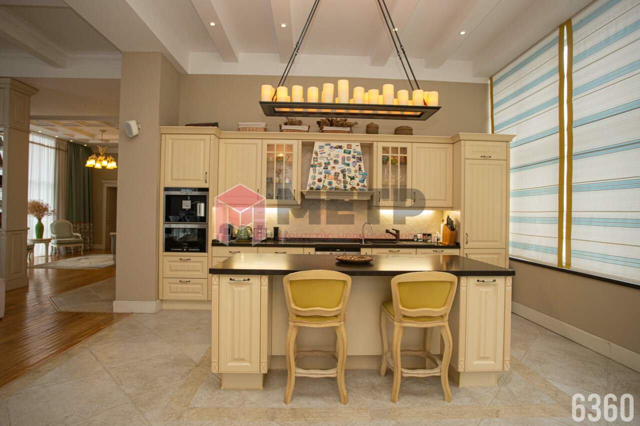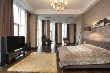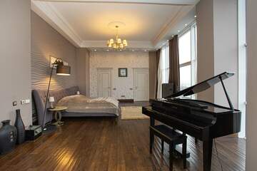Высота потолков около 4 метров усиливает ощущение масштаба, наполняя апартамент воздухом и естественным светом.